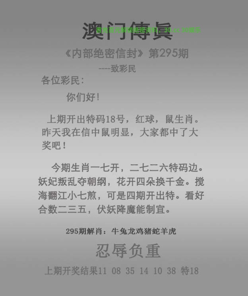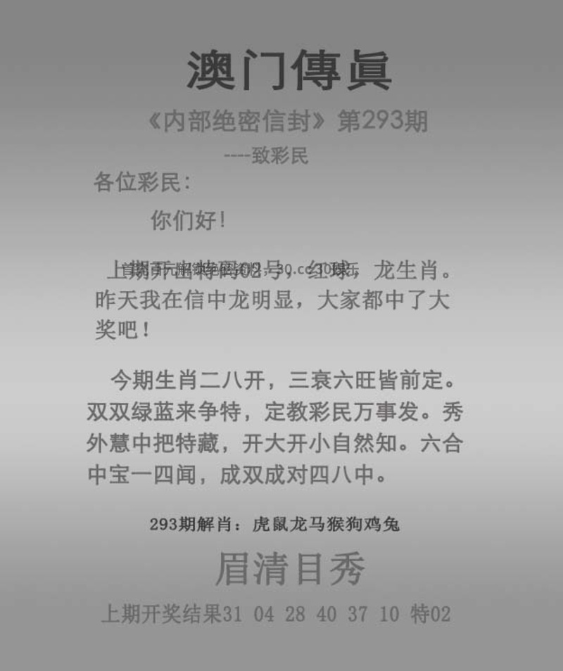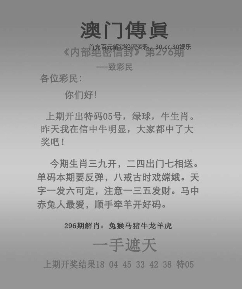 296期:今期生肖三九开,二四出门七相送。单码本期要反弹,八戒古时戏嫦娥。天字一发六可定,注意一三五发财。马中赤兔人最爱,顺手牵羊开好码。 |